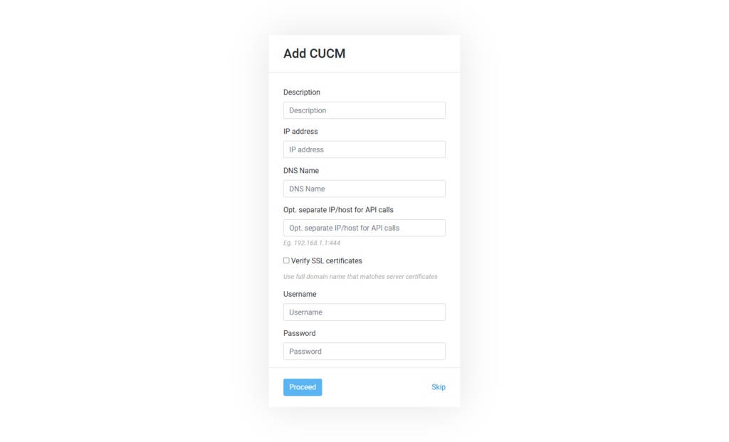 Click Proceed to add the CUCM server, or press Skip to skip or finish later.