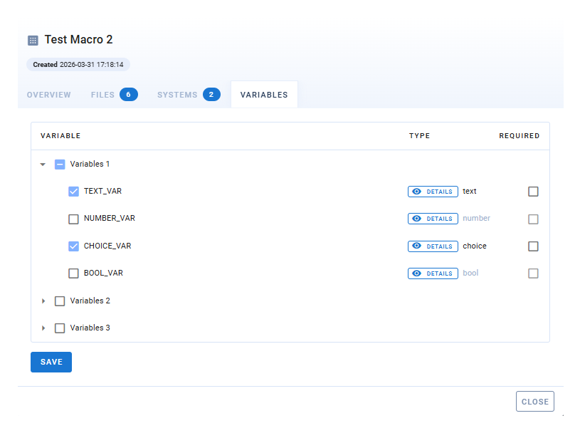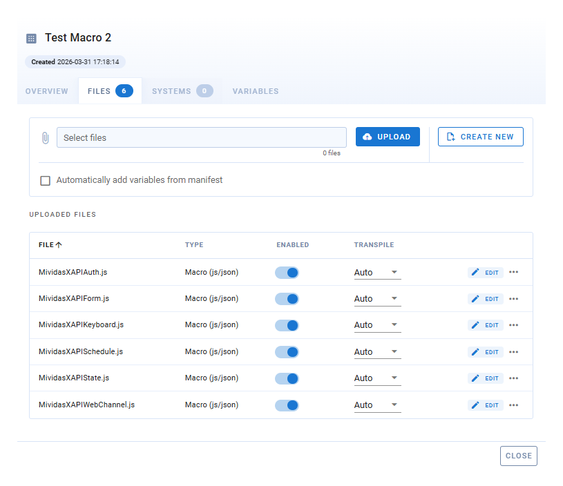 | Select files | Controls whether a macro file is transpiled (ES6+ → ES5) before being uploaded to a Cisco endpoint. Transpilation is needed because older endpoint runtimes can’t execute modern JavaScript. Auto – Auto-detect based on file content and endpoint runtime. Yes – Always transpile. No – Never transpile. |